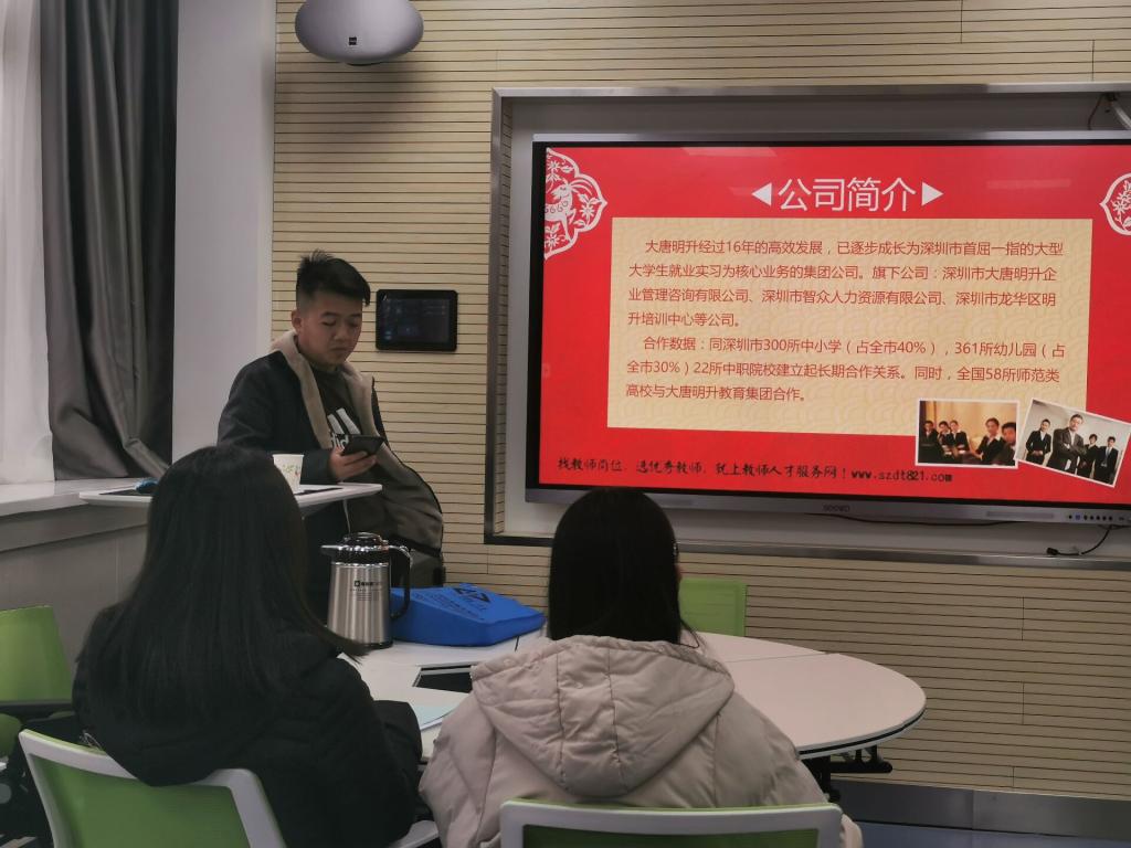 11月20日下午,深圳大唐明升教育集团在文科楼614智慧教室举办了实习与就业宣讲会,公司17级部分毕业生现场聆听。宣讲会上,大唐明升教育集团代表郭老师主要针对17级应届毕业生及往届未就业毕业生的就业形势进行了分析和解读。