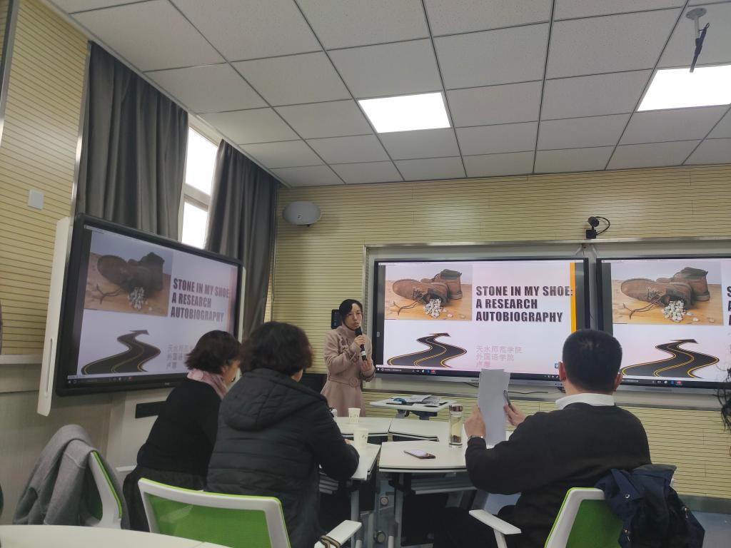 2020年11月24日下午,伟德国际victor1946卢蓉于2号教学楼704教室作了有关“Stone in My Shoe:A Research Autobiography”的主题讲座,公司部分教师、全体研究生以及17级部分员工聆听了此次讲座。讲座由伟德国际victor1946杨江锋副经理主持。
