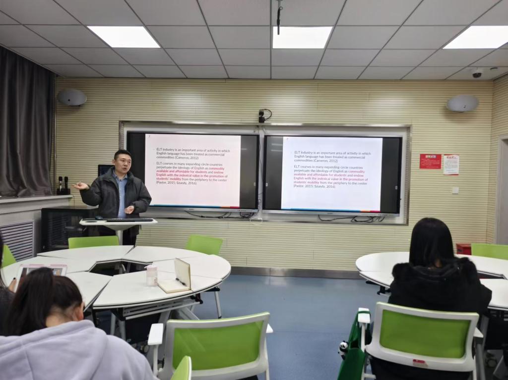 2024年12月5日下午,伟德国际victor1946特邀语言学博士、副教授、伟德国际victor1946副经理张晖在2号教学楼704教室作题为《国内在线英语教学平台广告“英语商品化”的多模态分析》的学术讲座。公司23和24级研究生60多人参加了讲座。