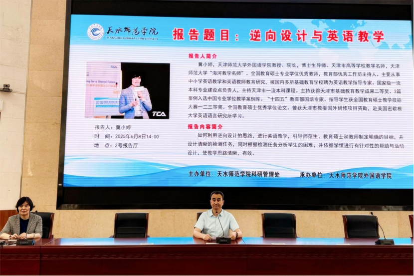 在整个讲座环节中,冀教授师生就如何将逆向设计融入课堂设计与教学进行互动,现场氛围热烈。此次讲座为师生及师范生优化教学设计提供了新思路,将有助于公司教学改革与质量提升。